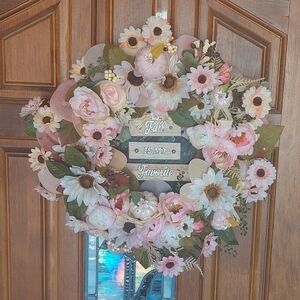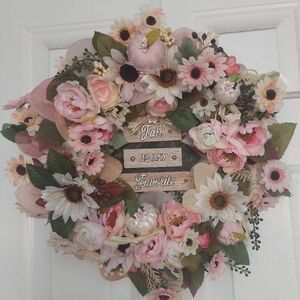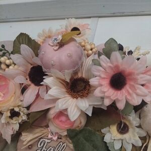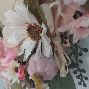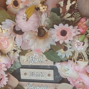 9Beautiful handmaid fall glam decor wreath About 18 to 20" total Beautiful light pink and Cream colored sunflowers and peonies And some light pink and pearl painted pumpkins With added lace small rhinestones and small pearls
