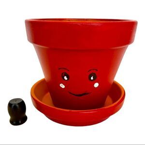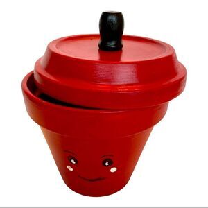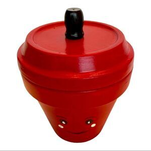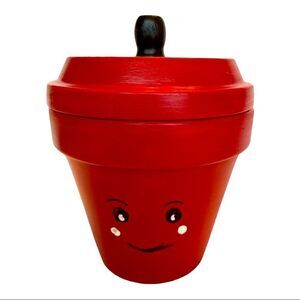 Apple red painted flower pot with a smiley face. Use it as a flower pot, a hiding spot for treats, or just a decorative touch in your kitchen.
