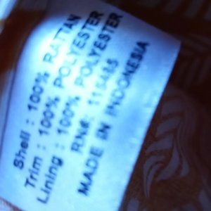 Size: 8" diameter, 2.5" deep; shoulder strap fall appx 24". The lining is made of polyester. It was made in Indonesia.