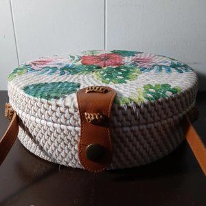 Carry your personal belongings securely in this NEW (tag not attached) eye-catching HAND-WOVEN RATTAN, ROUND CROSS-BODY BAG, depicting a large and bold HIBISCUS FLOWER πΊ in front. It is by COLLECTION EIGHTEEN.
