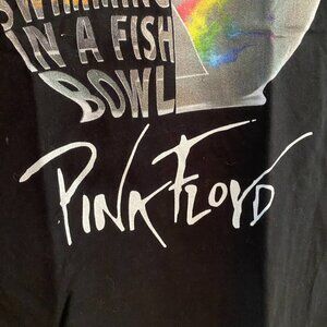Black short sleeve T-shirt with text referencing Pink Floyd's "Wish You Were Here" album. Text reads: "We're just two lost souls swimming in a fish bowl Pink Floyd". Image of goldfish with rainbow prism on the side.