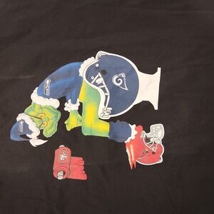 Black t-shirt featuring the Grinch in NFL gear. Vibrant design with team logos. Hanes size XL