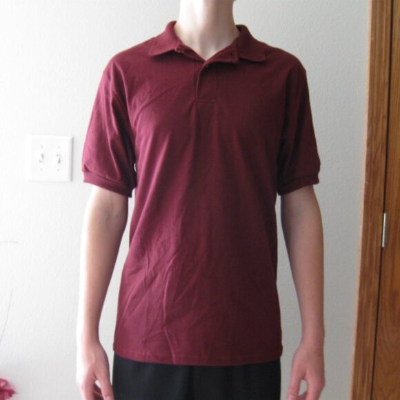 HANES UNISEX MEN'S SIZE SMALL (34 - 36) BURGUNDY POLO / GOLF SHIRT WOMEN'S NWT. Fabric: 50% Cotton, 50% Polyester. Stay Clean technology. Ribbed collar and 3/4 inch ribbing on sleeve. Two variegated tan buttons on classic front placket. Double top stitched hem. Would probably fit a women's size M. The pictures show the exact item you are purchasing. ** Color may be slightly off due to monitor color setting/flash of camera **.