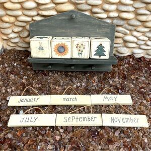 HANGING WOODEN YEARLY WALL CALENDAR with decorative numbers and blocks. Excellent pre-owned condition. This is the cutest calendar to hang on a wall in your home. Monthly plaque hang on the top peg while the date numbers and decorative blocks sit on a ledge/shelve below. Lastly pegs to hold remaining months plaques sits below. Decorative blocks have holiday/seasonal themes. All plaques & blocks are included to include all the months & days of the year. Ships from a smoke and pet free home.