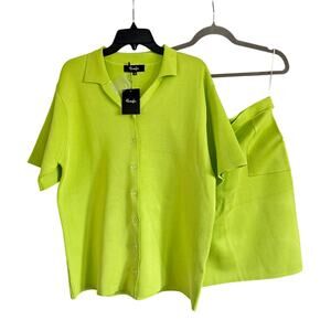 Description: Button front shirt. Collared. Thick, stretchy material. Front slit on skirt. Patch pockets. Elastic waistband. Made in USA.