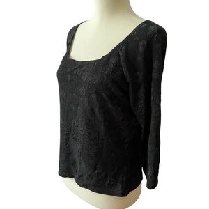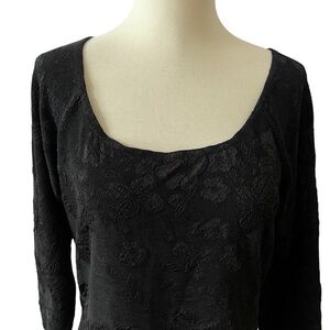 All black, floral pattern, womens size Large, pull on, elbow length sleeves, deep round neckline.