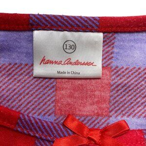 The HANNA ANDERSON Girls Flannel Nightgown in size 130/8 is a cozy and festive addition to any young girl's wardrobe. Featuring a classic check pattern in purple and red, this long sleeves nightgown is perfect for the holiday season or cold weather. Made of soft polyester flannel, this pullover gown is easy to care for as it is machine washable. With its timeless style and high-quality construction from the trusted brand Hanna Andersson, this nightgown is sure to keep any little girl warm and comfortable throughout the winter, fall, or spring seasons.
