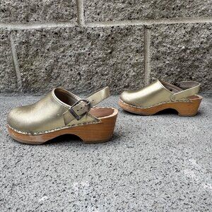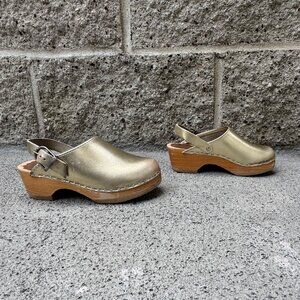 HANNA ANDERSSON Gold Slingback Wooden Clogs Girls 11.5 29 Metallic Leather Clog