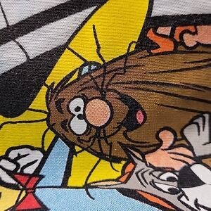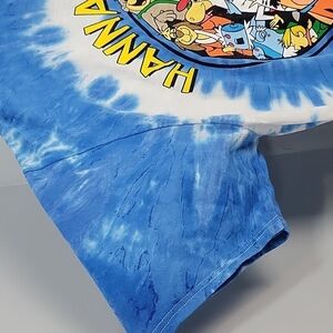 Hanna Barbera short sleeve t-shirt. BLue tie dye. Fred Flinstone, Captain, Caveman, Magilla Gorilla, Yogi Bear, George Jetson, Huckleberry Hound, Barney Rubble, Fred Jones, Jane Jetson, Judy Jetson, Elroy Jetson, Rosey the Robot, Boo Boo Bear, Space Ghost and Quick Draw McGraw on the front. 100% cotton. Size XL