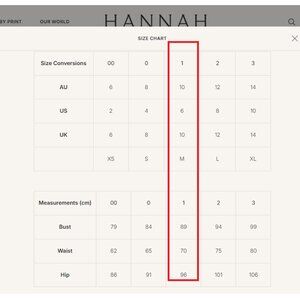 Size 1/US 6 (Hannah size chart included in last photo in gallery)