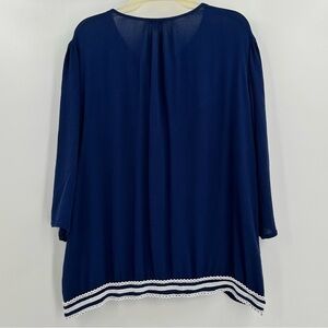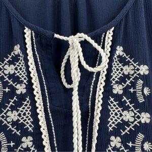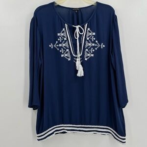 HANNAH Women’s Dark Blue with White Embroidery & Tassle Tie Top Size Medium