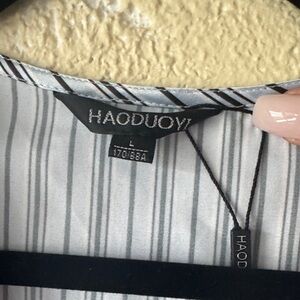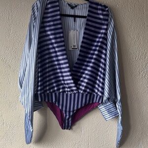 HAODOUYI (not Zara) 🙂 Elegant V-neck bodysuit with blue and purple stripes. Features a stylish tie front. Size Large. Never worn with tags