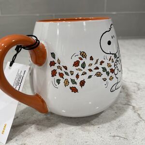 Enjoy your favorite fall beverage in this cheerful coffee mug featuring Snoopy in blowing leaves. HAPPY FALL written in the bottom inside. The mug has a capacity of 16 fl oz and is made of high-quality stoneware. The mug is perfect for hot or cold beverages and is ideal for celebrating Fall or Thanksgiving. Cross-listed.
