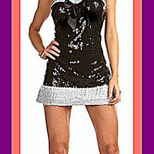 The Tinsel Town costume includes a shimmering sequin covered black cocktail dress