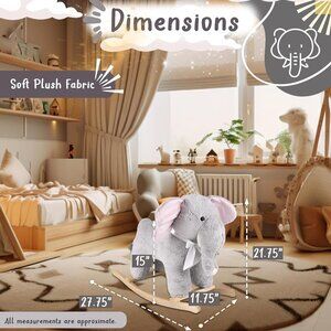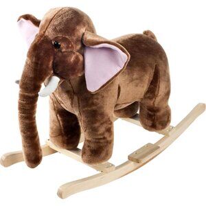 This delightful stuffed elephant rocker boasts a soft brown plush body with charming pale pink inner ears accents. Its sturdy wooden base ensures a smooth rocking motion, while the large floppy ears and curved trunk enhance its adorable design. Stands on sturdy wood rockers. Makes elephant sounds if a button on the left ear is pressed. Perfect for imaginative play, this toy is a wonderful addition to any playroom.