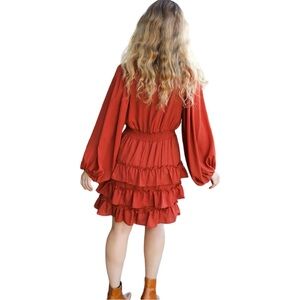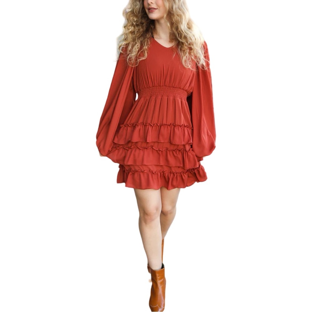 Step out in style with this elegant rust dress. Featuring a lined smocked waist wool dobby dress with a V neck. Bubble ruffle sleeves and tiered ruffle design complete this stunner!
