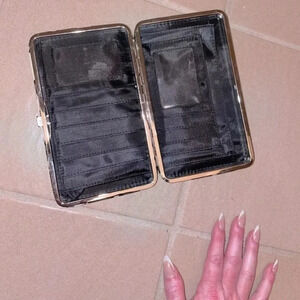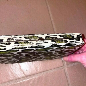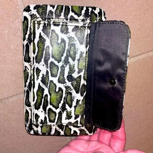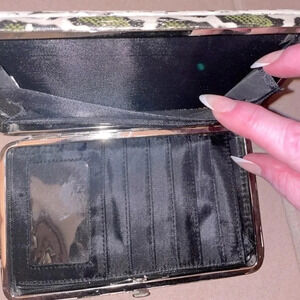 Ivory. Black and Green with touches of brown python faux leather hard case Clutch Wallet . Gold hardware. Inside has rings to attach shoulder chain. There are plenty card slots and cash slots and a snap lock on the outside for change or cards as well