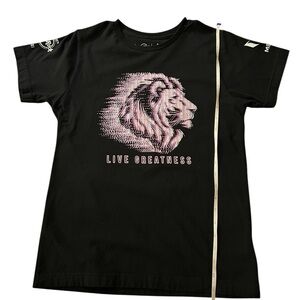 Front has a lion graphic using letters and says LIVE GREATNESS
