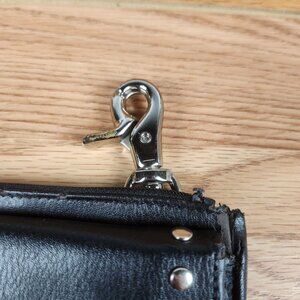 Crafted with durable black leather, this Harley-Davidson wallet features a studded design and metal logo. Equipped with sturdy clasp attachments for secure use.