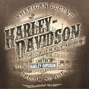 Nice brown Crewneck t-shirt by Harley-Davidson. Short sleeves. Front has a large tan graphic that says American Legend - Follow No One - Harley Davidson Motorcycles. Back has a large multicolor graphic of Grand Rapids Michigan H-D. Great preowned condition. Unisex size large.