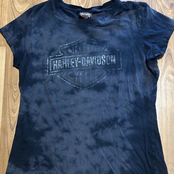 This product is a preowned Harley-Davidson ladies black t-shirt in size medium. It features a short sleeve design, round neckline, and is made of 100% cotton material. The basic style and iconic brand make it a versatile and comfortable option for women looking to add a touch of motorcycle-inspired flair to their wardrobe. Measures 18' pit to pit.