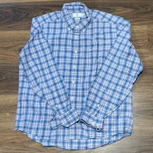 This is a women's short sleeve plaid shirt with snap buttons and an inside out hem. It features an embroidered Harley Davidson logo and is a size medium in blue.
