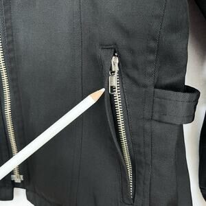 **1 zipper is missing leather pull. Rubbed spot on left arm cuff. Inside pocket missing grommet. Some blemishes on fabric, see photos for all details.*