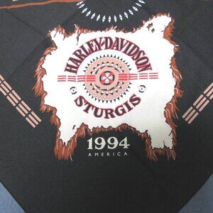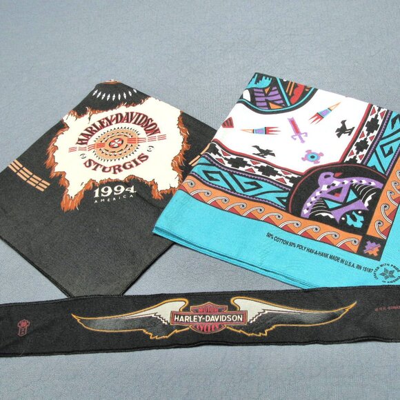 Super deal...Never used 1994 Sturgis, Harley-Davidson earth-tone bandana with wonderful tribal graphics. I bought this the first year we went to Sturgis, but never used it, so it is in like-new condition. Also, in like-new condition a HAV-A-HANK, tribal bandana, made in U.S.A. I purchased it “somewhere” out west, but it was never used. Bright, colorful graphics and great design. And a cool Officially Licensed Harley-Davidson black hair band with a nice Harley wing design made by R K. Stratman Inc. I think I wore this once or twice, but it also is like new. So, these bandanas and the hair band are all you will need to keep you and your hair looking awesome for a late summer and fall on the road.