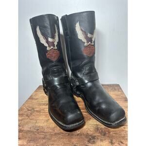 Classic Harley-Davidson leather engineer boots with bold eagle logo embroidery, a rugged motorcycle staple perfect for biker style, moto fashion, and collectors of vintage Harley gear.
