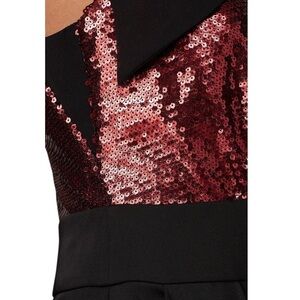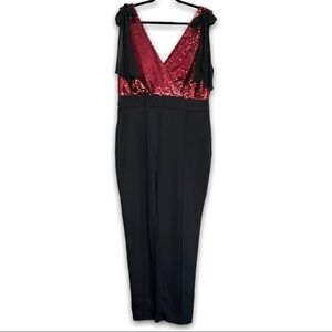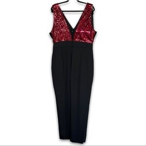 Black twill with cranberry red sequin bodice. Black side stretch bodice panels. Jumpsuit. Sleeveless. V-neckline. Hidden back zipper with hook-and-eye closure. Partially lined. Side pockets. 97% Polyester, 3% Spandex. Size extra extra large/2XL. Approximate measurements: 27.5” inseam, 15” rise, 40” bust, 35” waist. Good condition with a few missing sequins under one arm and by back zipper (pictured).