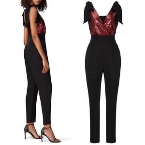 Feminine shoulder ties soften this dazzling sequin top Harlyn jumpsuit styled with tailored pants and an alluring V-neckline.
