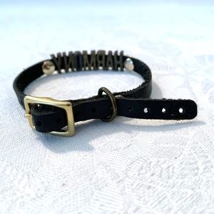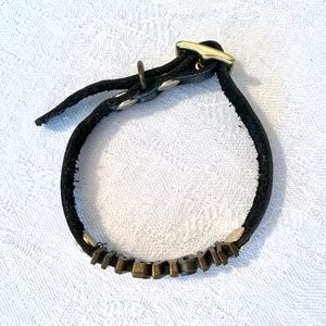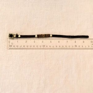 Leather bracelet with "harmony" spelled out with antique brass color letters