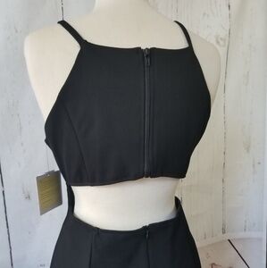 New with tags black halter fitted sheath dress. Thin straps is featured connected at the back revealing a low cutout detail. This dress also features a sheath silhouette with a back zipper closure, and slight side slit. Material does stretch.