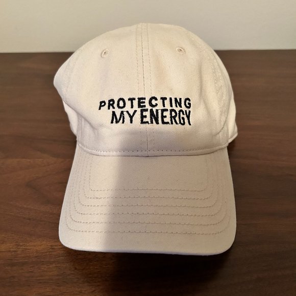Beige baseball hat with "Protecting My Energy" sewn in black letters in the front.