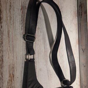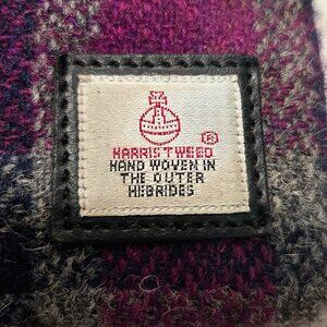 Made by HARRIS TWEED. Beautiful black, gray and purple tweed cross body purse. One side is tween the other is leather. Preowned - never used. Strap is adjustable. Zipper pocket on leather side. Small zipper pocket on front as well. Zipper closure at top with pockets and divider inside. Measures approximately 10.5" tall by 9" wide. Purchased in SCOTLAND.