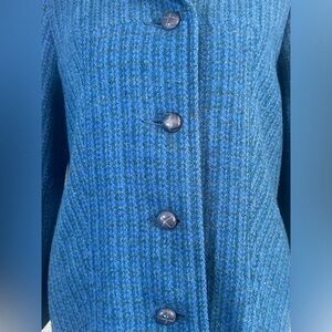 Vintage Harris tweed handwoven 100% pure Scottish wool will fit a woman’s size Extra Large PTP 23” beautiful colors, blue green and gray button down. It has two front pocket.