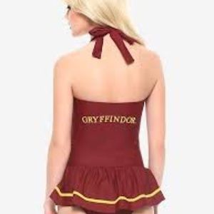 Take your House pride to the pools. This burgundy Gryffindor swimsuit features a halter top and skirted bottom with golden yellow trim. There is elasticated backing with "Gryffindor" printed in golden yellow. There are molded cups with underwire and golden yellow trim that offer built-in support. Features a metal Gryffindor crest embellishment at the bust.