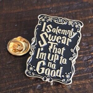 COPPER pin with black enamel that reads "I SOLEMNLY SWEAR THAT I'M UP TO NO GOOD" Remember this is the spell you need to say to see the Marauder's Map!