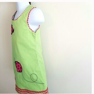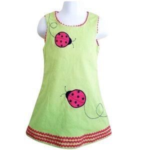Adorable little girls HARTSTRINGS ladybug dress on Apple green micro corduroy jumper. Zips on side. In excellent pre-owned condition from pet-free/smoke-free home.