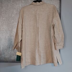100% linen women's shirt long sleeves with front patch pocket, button pleated cuffs, front button closure, side slits