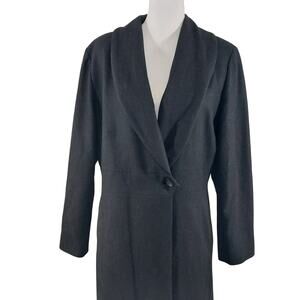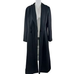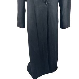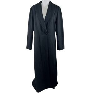 An incredibly sophisticated fine wool coat, jacket, full length and full of vogue style! In rich, saturated black, it features a one button front, clean, long lines, hidden front pockets, and is fully lined in black poly satin! Truly an elegant, understated dress coat! Size L, worn just twice! No tags available, but it is a wool blend and dry clean! Excellent! Superb EUC Condition! **ABSOLUTELY GUARANTEED CONDITION: EUC MINTY-EXCELLENT TO LIKE-NEW, by Lily @HauteClub!***