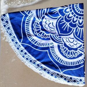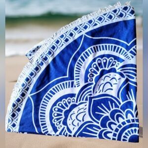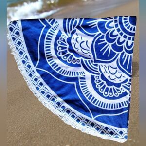 HARVE' BERNARD circular Blue/ White BEACH BLANKET 56" 2" FRINGE NEW! BOHO