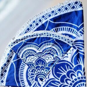 Towel is a white & blue BOHO print with a 2" white fringe.