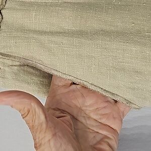 Great linen tan color pants. Elastic in back of pants. Very good used condition and quality. There is no size tag. I'm guessing a Medium to Large. Waist flat measurement is Waist flat measurement is 16". Inseam is 27" rise is 11/15. Consider making a bundle and get an even better offer.