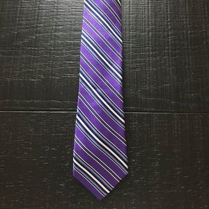 HASPEL striped tie. 100% SILK. Condition is used. Purple with blue and white stripes. 2 colors of blue - navy and light blue. Standard tie. Length is 57" approximately. Width is 3" approximately.