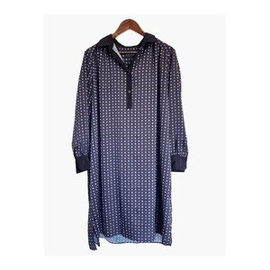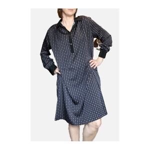 This Hatch dress features a sophisticated dark blue hue with a classic polo collar and long sleeves, perfect for casual or work settings, relaxed fit