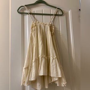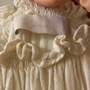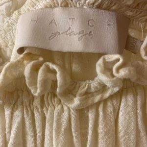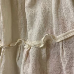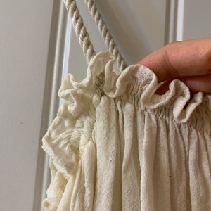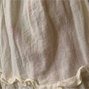 HATCH Maternity Tank with ruffle hem. Rope straps and ruching around the top. I loved this top. I wore it while pregnant, nursing and a few times after that with a tank top or nursing top underneath. I’ve also worn it with just a bra underneath. It’s a bohemian chic style and very sheer. Color is natural/ivory. I think the material is linen. It has weight to it and isn’t super thin. I’m usually a size XS so that’s what I put but I think it’s one size fits most.