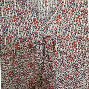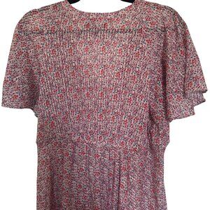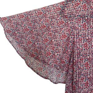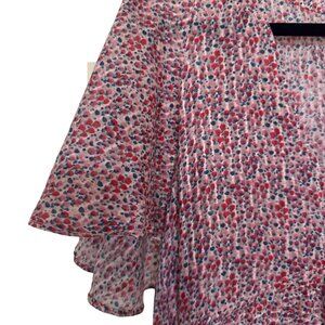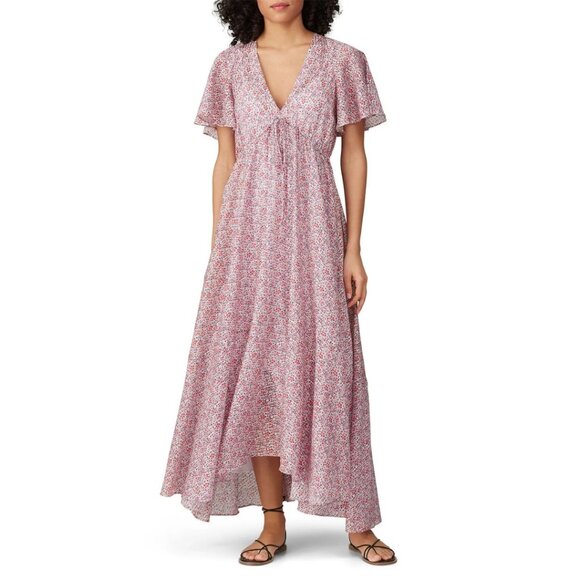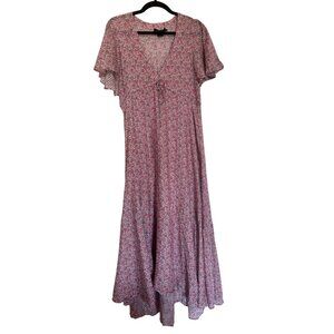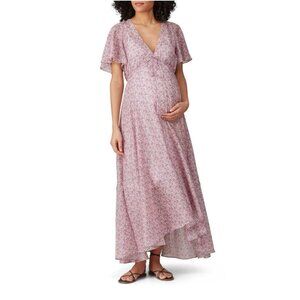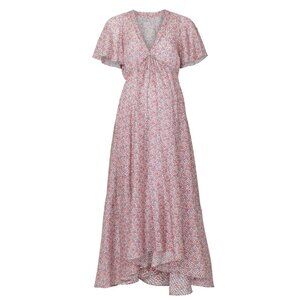 Hatch The Margarette Maternity Maxi Dress. Features a charming pink floral print, short flutter sleeves, v-neckline, and empire waistline with adjustable drawstring tie under bust. With its relaxed fit and gentle stretch, can be worn during pregnancy or for everyday wear, whether you're running errands or attending a special occasion. Color: Bittersweet Pink. Size 2, which is a maternity medium in this brand (6-8 US). Shell: 55% Cotton, 45% Silk. Lining: 100% Viscose. Great preowned condition from Rent the Runway. Please note that the material is a bit sheer but perfect for warm days.