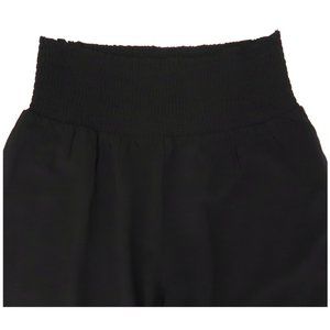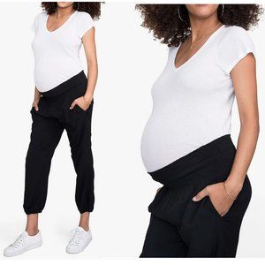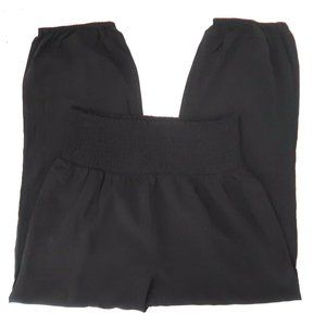 Hatch 'The Weekend Pant' in black. Smocked waist. Tapered, cropped leg with elastic at bottom. Side front pockets. Soft, lightweight 100% rayon. New with tags, original retail was $168. Size 2, equals Medium. Garment measurements-- waist, not stretched: 28" hips: 45" front rise:13 1/4" inseam: 26" width around bottom of leg: 12 1/2"