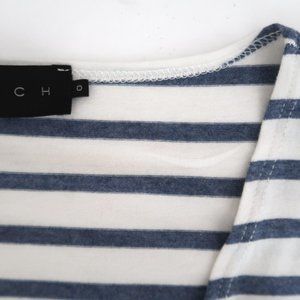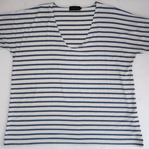 Shirt is super comfortable and in good used condition. Fabric has worn look (via style of slight heathering of the blue stripes), but does not have any stains, rips, pulls, etc. I would still wear post-pregnancy if I could!